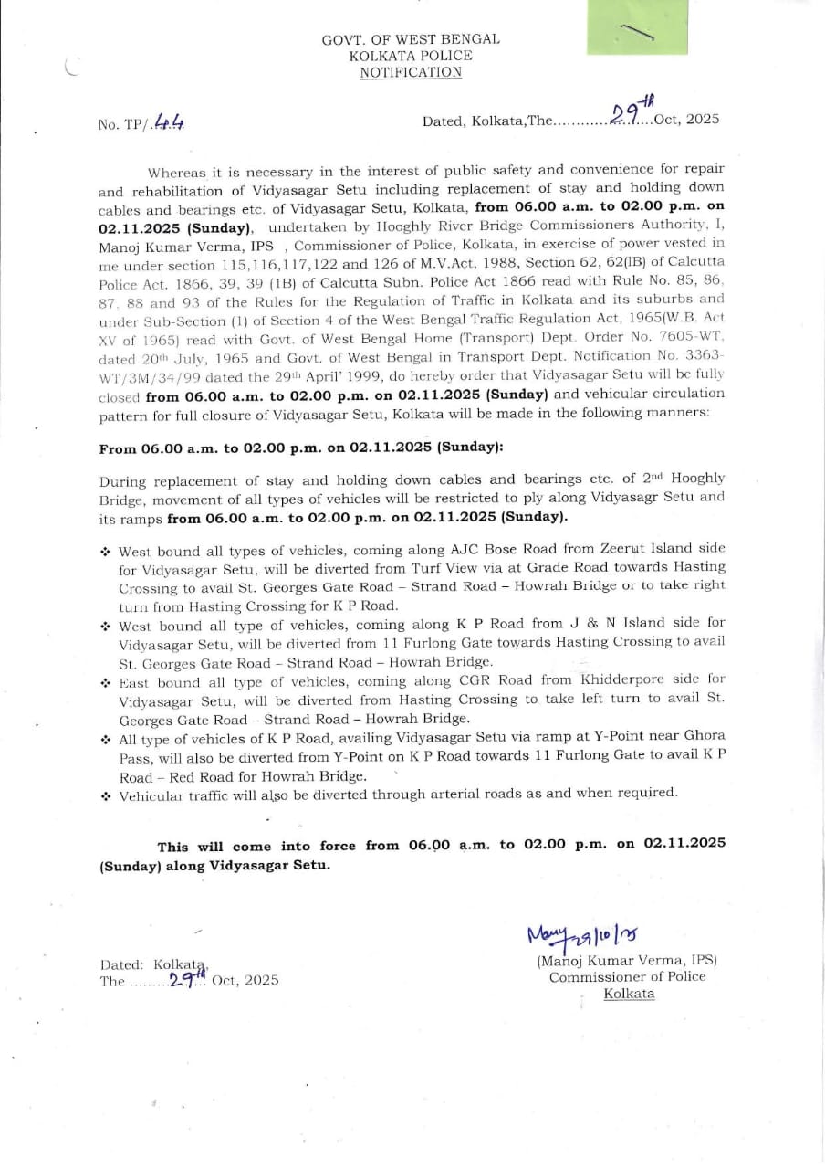 জানা গিয়েছে, স্টে এবং হোল্ডিং-ডাউন কেবল প্রতিস্থাপন সহ মেরামত ও রক্ষণাবেক্ষণের কাজের জন্য বিদ্যাসাগর সেতু বন্ধ থাকবে। ইতিমধ্যে এই বিষয়ে বিজ্ঞপ্তি জারি করেছে কলকাতা পুলিশ। পুলিশের তরফে জানানো হয়েছে, ২ নভেম্বর, অর্থাৎ আগামীকাল রবিবার সকাল ৬টা থেকে দুপুর ২টো পর্যন্ত বিদ্যাসাগর সেতু সম্পূর্ণ বন্ধ রাখা হবে।