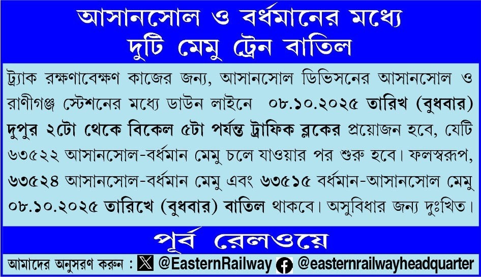 বর্তমানে উৎসবের মরসুম চলছে। আর এই উৎসবের মরশুমে সকলের মধ্যে একটি খুশির আমেজ বিরাজ করছে। কেউ হয়তো ট্রেনে করে ঘুরতে যাচ্ছেন তো কেউ কিংবা আবার যে যার বাড়ি যাচ্ছেন। তবে এই খুশির মধ্যেই ভাটা পড়তে চলেছে। আসলে পূর্ব রেলের তরফে জারি করা এক বিজ্ঞপ্তি অনুযায়ী, আসানসোল ও বর্ধমানের মধ্যে চলাচলকারী ২টি মেমু ট্রেন বাতিল থাকবে। নিশ্চয়ই ভাবছেন যে আচমকা রেলের তরফে এরকম সিদ্ধান্ত কেন নেওয়া হল কিংবা কবে ট্রেন বাতিল থাকবে? রেলে তরফে জানানো হয়েছে ট্র্যাক রক্ষণাবেক্ষণ কাজের জন্য আসানসোল ডিভিশনের আসানসোল ও রানিগঞ্জ স্টেশনের মধ্যে ডাউন লাইনে আগামী ৮. ১০, ২০২৫ অর্থাৎ বুধবার দুপুর ২টো থেকে বিকেল ৫টা অবধি ট্র্যাফিক ব্লকের প্রয়োজন হবে যেটি কিনা ট্রেন নম্বর ৬৩৫২২ আসানসোল-বর্ধমান মেমু চলে যাওয়ার পর শুরু হবে।