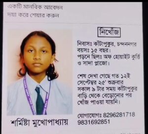 জানা গিয়েছে, স্কুলে শিক্ষক দিবসের অনুষ্ঠানে যাওয়ায় জন্য বাড়ি থেকে বেরিয়ে ছিল বছর ১৫-র শর্মিষ্ঠা মুখোপাধ্যায়। সে ইমামবাড়ার কাছে একটি বেসরকারি ইংরেজি মাধ্যম স্কুলে ক্লাস টেনের ছাত্রী। এই বছর তার বোর্ড পরীক্ষা দেওয়ার কথা ছিল। পৈতৃক বাড়ি চুঁচুড়া কোদালিয়ায়। গত ৯ মাস আগেই তার মায়ের ক্যান্সার রোগে মৃত্যু হয়। এদিকে বাবারও মৃত্যু হয়েছে। সেই থেকে চন্দননগরের কাঁটাপুকুরে মামার বাড়িতেই ওই ছাত্রীর আশ্রয়স্থল হয়ে উঠেছিল। যাইহোক, গত এক সপ্তাহ ধরে সে নিখোঁজ।