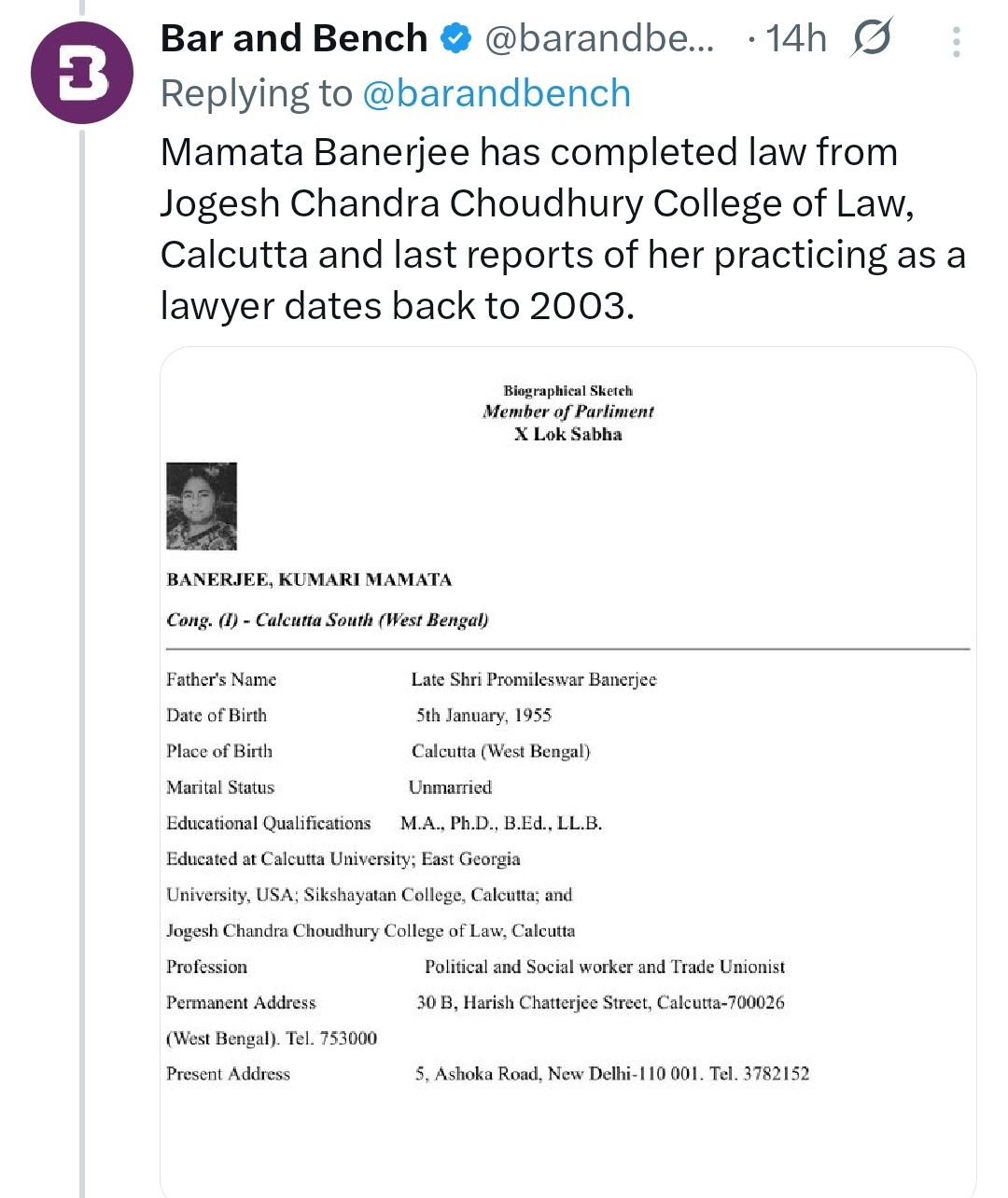 তবে হ্যাঁ, মমতা বন্দ্যোপাধ্যায় এল.এল.বি ডিগ্রি অর্জন করলেও তিনি কোনও আইনজীবী নন। অর্থাৎ, তিনি প্র্যাকটিসিং আইনজীবী হিসেবে দায়িত্ব সামলাতে পারেন না। আজ তিনি শুধুমাত্র সাধারণ আবেদনকারী হিসাবেই এই মামলা লড়েছেন। মোদ্দা কথা বলতে গেলে, তিনি কোনও রাজ্য বা বার কাউন্সিলে ভর্তি হননি। তাই অল ইন্ডিয়া বার পরীক্ষা পাস করেননি। এমনকি বার কাউন্সিল অফ ইন্ডিয়া থেকে প্রাক্টিস সার্টিফিকেটও পাননি। তাই তাঁকে প্র্যাকটিসিং অ্যাডভোকেট হিসেবে বিবেচনা করা যাবে না।