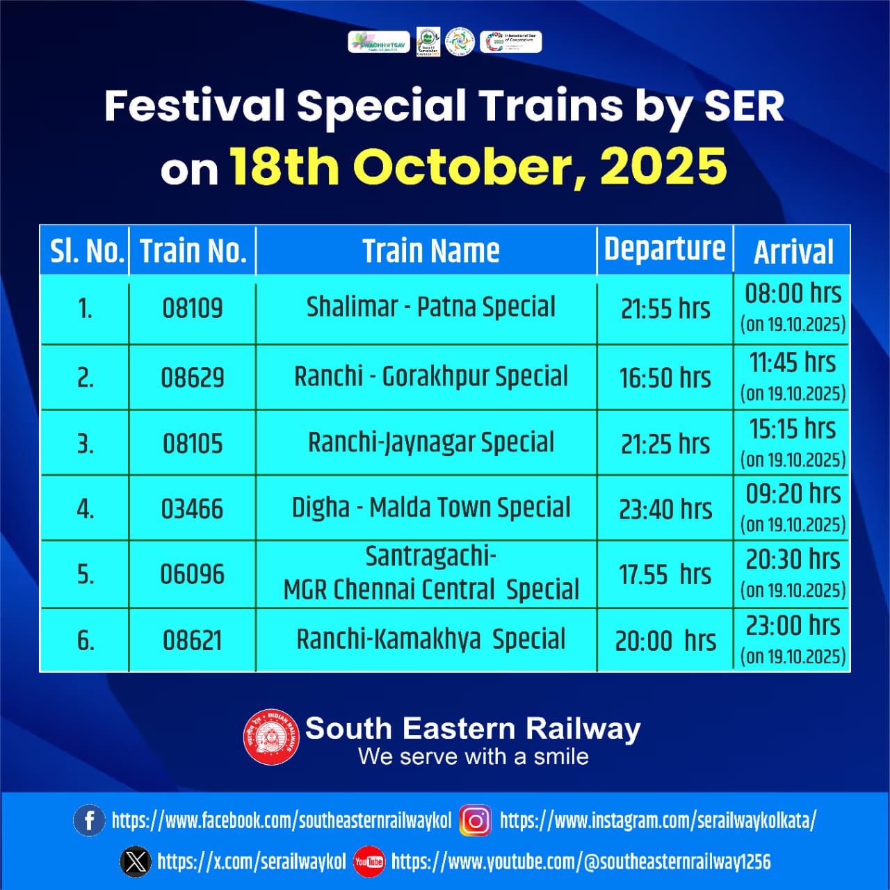 শুধু তাই নয়, আজ ১৮ অক্টোবর বিভিন্ন রুটে ছয়টি স্পেশাল ট্রেন চালাবে দক্ষিণ পূর্ব রেল। তালিকায় রয়েছে ট্রেন নম্বর ০৮১০৯ শালিমার পার্টনা স্পেশাল, ০৮৬২৯ রাঁচি গোরখপুর স্পেশাল, ০৮১০৫ রাঁচি-জয়নগর স্পেশাল, ০৩৪৬৬ দিঘা মালদা টাউন স্পেশাল, ০৬০৯৬ সাঁতরাগাছি-এমজিআর চেন্নাই সেন্ট্রাল স্পেশাল এবং ০৮৬২১ রাঁচি-কামাখ্যা স্পেশাল।