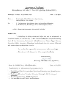মুখ্যমন্ত্রী জানিয়েছেন, প্রাকৃতিক দুর্যোগের কারণে এই সিদ্ধান্ত নেওয়া হয়েছে। সরকারি স্কুলের পাশাপাশি আইসিএসআই ও সিবিএসই বোর্ডের স্কুলগুলোতে অন্তত দু’দিন করে ছুটি দেওয়ার অনুরোধ জানিয়েছেন তিনি। এমনকি বিশ্ববিদ্যালয়গুলিকে পরামর্শ দেওয়া হয়েছে, আগামী দুই দিন যাতে অনলাইনে ক্লাস চালানো যায়, তার ব্যবস্থা করতে। শিক্ষা দপ্তরের বিজ্ঞপ্তি অনুযায়ী, সরকারি স্কুলে ২৪ ও ২৫ সেপ্টেম্বর ছুটি থাকবে।