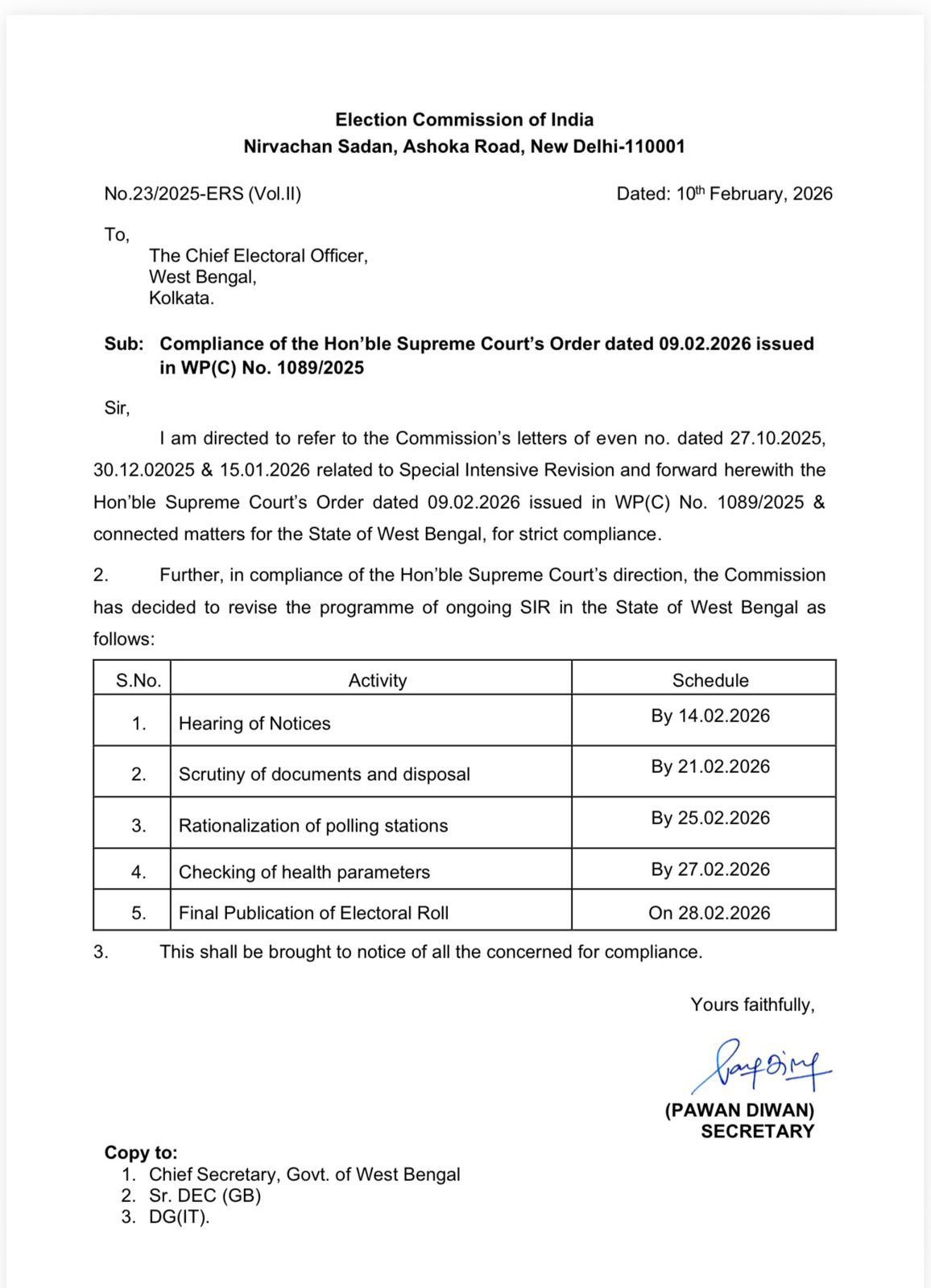 SIR আবহে শীর্ষ আদালত স্ক্রুটিনির জন্য আরও ৭ দিন সময় অতিরিক্ত দেওয়ায় স্বাভাবিকভাবেই সকলের মনে প্রশ্ন জাগছে তাহলে কবে চূড়ান্ত ভোটার তালিকা প্রকাশিত হবে। কারণ সুপ্রিম কোর্টের নির্দেশের পরই স্পষ্ট হয়ে যায়, রাজ্যে চূড়ান্ত ভোটার তালিকা প্রকাশের দিন পিছোতে চলেছে৷ এইজন্য গতকালই দিল্লিতে কমিশনের ফুল বেঞ্চের সঙ্গে বৈঠক করেন রাজ্যের মুখ্য নির্বাচনী আধিকারিক মনোজ আগরওয়াল। সবশেষে বহু আলোচনা পরই ভোটার তালিকা প্রকাশের নতুন দিনক্ষণ জারি করল নির্বাচন কমিশন৷ জানানো হয়েছে আগামী ২৮ ফেব্রুয়ারি রাজ্যে চূড়ান্ত ভোটার তালিকা প্রকাশিত হবে।