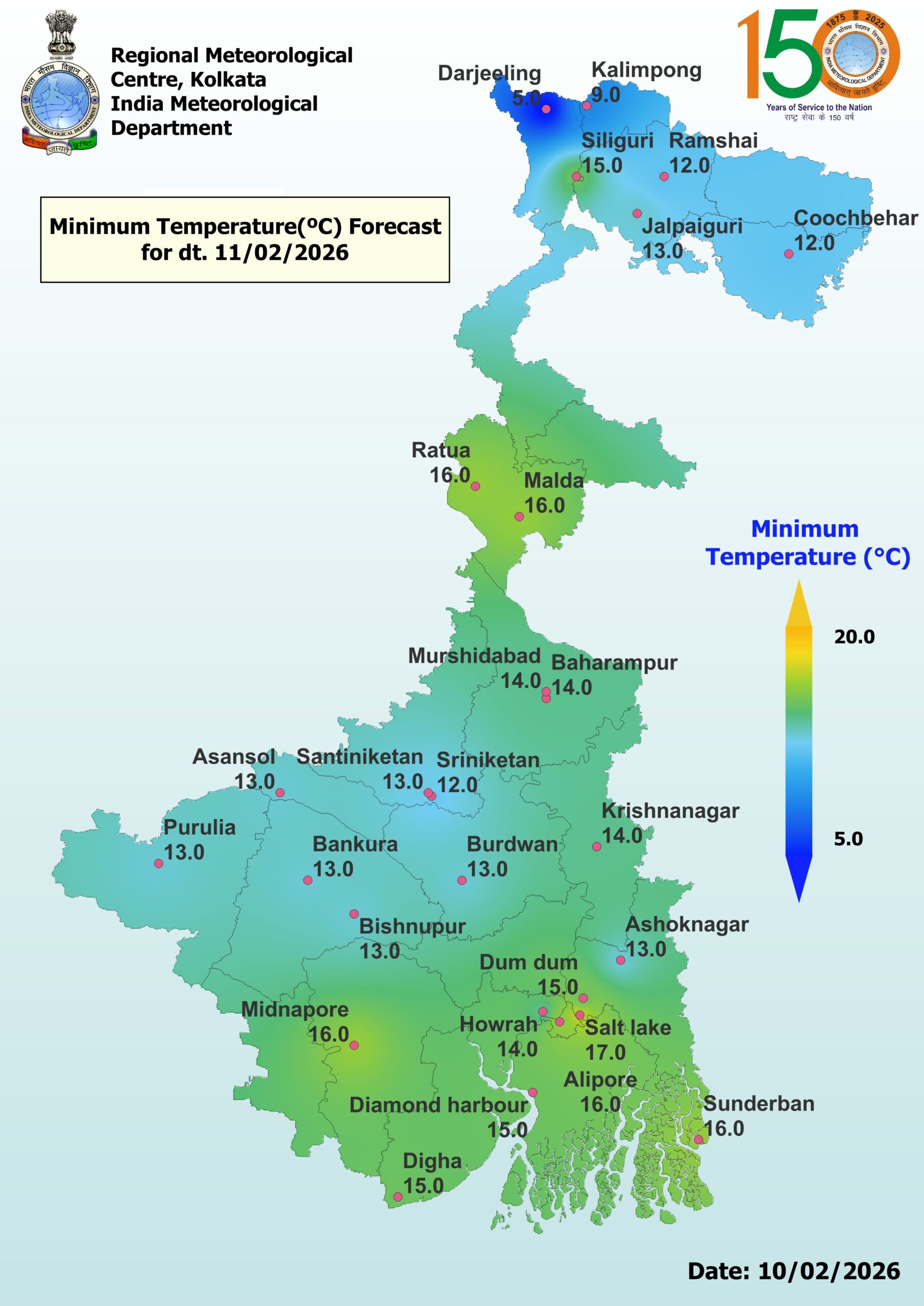 প্রথমেই আসা যাক দক্ষিণবঙ্গের আবহাওয়া (Weather Today) প্রসঙ্গে। আলিপুর আবহাওয়া দফতরের তরফে জারি করা বুলেটিন অনুযায়ী, আজ বুধবার পূর্ব ও পশ্চিম বর্ধমান, পুরুলিয়া, বাঁকুড়া, বীরভূম, নদীয়া জেলায় ভালোমতো শীতল আবহাওয়া বিরাজ করবে। উল্লেখিত জেলাগুলি সর্বনিম্ন তাপমাত্রা ১০ থেকে ১৩ ডিগ্রি সেলসিয়াসের মধ্যে থাকার সম্ভাবনা রয়েছে।