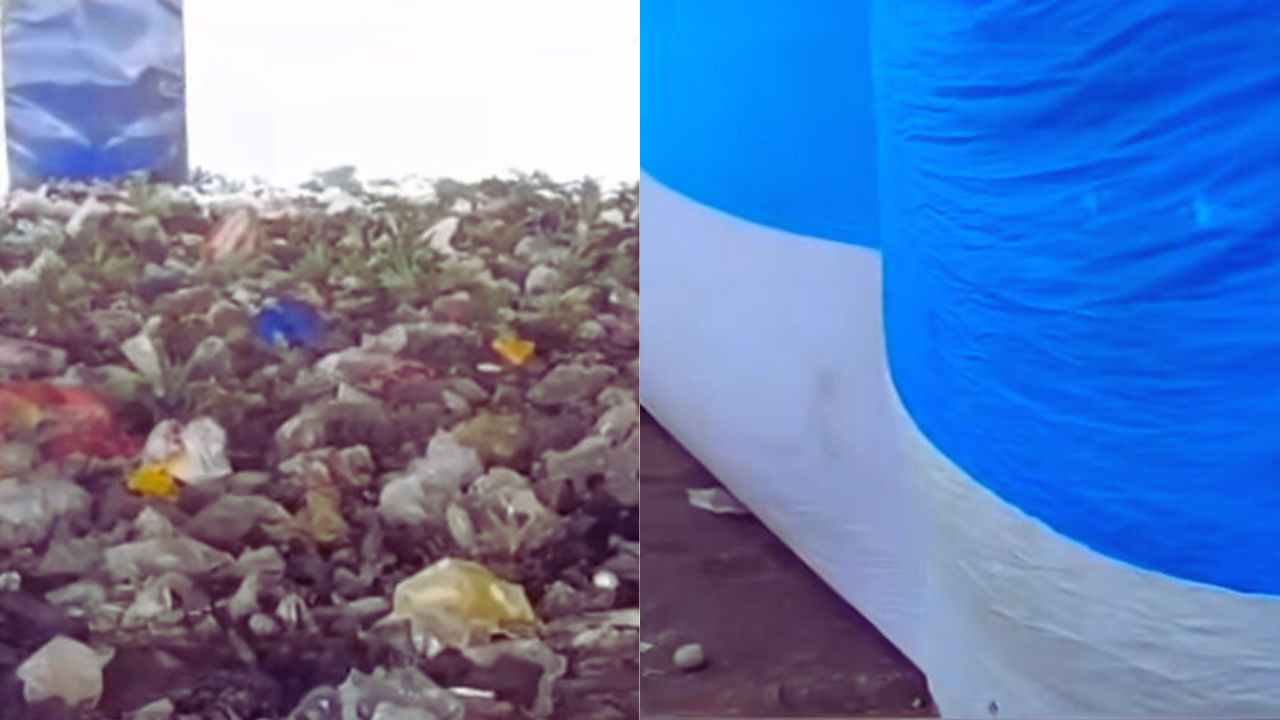 আবর্জনা আড়াল করতে নীল সাদা কাপড়ের ব্যানার