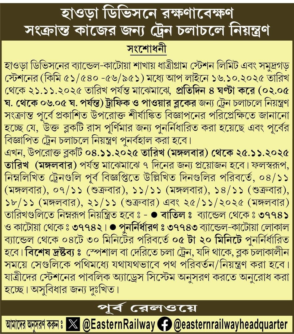 অপরদিকে হাওড়া ডিভিশনের ব্যান্ডেল কাটোয়ার শাখায় ধাত্রীগ্রাম স্টেশন লিমিট ও সমুদ্রগড় স্টেশনের মধ্যে আপ লাইনে আগামী ২১ নভেম্বর অবধি মাঝে মাঝে প্রতিদিন চার ঘণ্টা করে ট্রাফিক ও পাওয়ার ব্লকের জন্য ট্রেন চলাচলের ক্ষেত্রে নিয়ন্ত্রণ করা হবে। এর ফলে চলতি মাসে ব্যান্ডেল কাটোয়া শাখায় বহু ট্রেন বাতিল থাকবে।