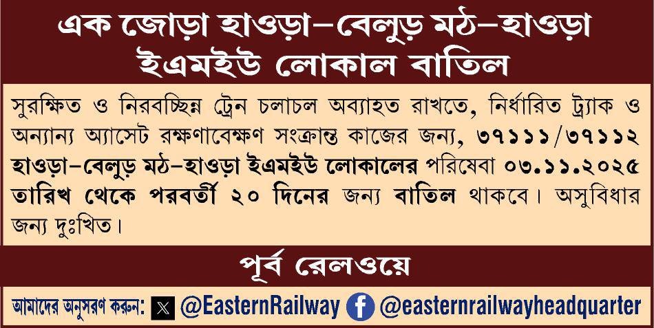 পূর্ব রেলের তরফে জারি করা বিজ্ঞপ্তি অনুযায়ী, হাওড়া-বেলুড় মঠ রুটে লোকাল ট্রেন পরিষেবা বন্ধ থাকবে। সুরক্ষিত এবং নিরবিচ্ছিন্ন ট্রেন চলাচল অব্যাহত রাখতে নির্ধারিত ট্র্যাক ও অন্যান্য অ্যাসেট রক্ষণাবেক্ষণ সংক্রান্ত কাজের জন্য ট্রেন নম্বর ৩৭১১/৩৭১১২ হাওড়া বেলুড় মঠ হাওড়া ইএমইউ লোকালের পরিষেবা আগামী ৩ নভেম্বর থেকে পরবর্তী ২০ দিনের জন্য বাতিল থাকবে। ইতিমধ্যে এই অসুবিধার জন্য রেলের তরফে যাত্রীদের কাছে ক্ষমাও চাওয়া হয়েছে।